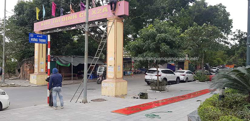 Biển chữ alu vàng gương hoặc biển bạt lắp tại cổng chào lối vào tổ dân phố (nên làm chất liệu này)