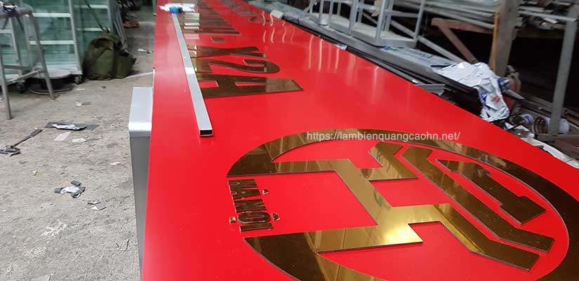 Biển chữ alu vàng gương thực chất là một loại biển quảng cáo aluminium màu đỏ được làm từ khung cứng bằng thép hộp mạ kẽm, bao bọc lấy khung thép cứng đó là tấm nen chất liệu aluminium composite màu đỏ, mặt biển dán chữ màu vàng gương - màu vàng óng ánh như kim loại lên trên trông rất đẹp mắt.