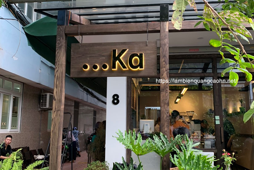 Biển quảng cáo quán cafe này làm từ vật liệu giả gỗ với bề mặt được dán tấm vân gỗ và cốt bên trong là vật liệu phổ thông của ngành quảng cáo: khung aluminum composite. Biển kết hợp với LED và inox đã cho ra một sắc thái biển hiệu mới khá hoàn hảo và sang trọng.
