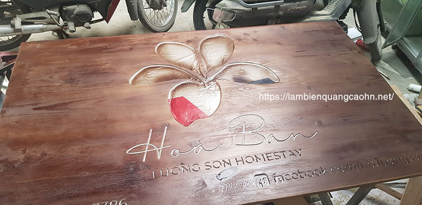 Biển quảng cáo gỗ cho homestay hoàn toàn có thể sử dụng phương án in thay cho phương án khắc chìm như bạn đang quan sát ở trên mà không làm mất đi màu gỗ hoặc phai màu theo thời gian. Phương án in UV trực tiếp lên gỗ bằng máy in phẳng đã giúp độ bền của các phần tử in (nội dung trên biển gỗ) trở nên bền hơn rất nhiều so với các công nghệ làm màu chữ truyền thống. Thời gian bền của mực UV có thể lên tới 4 năm. Xem thêm ảnh homesstay này nhé