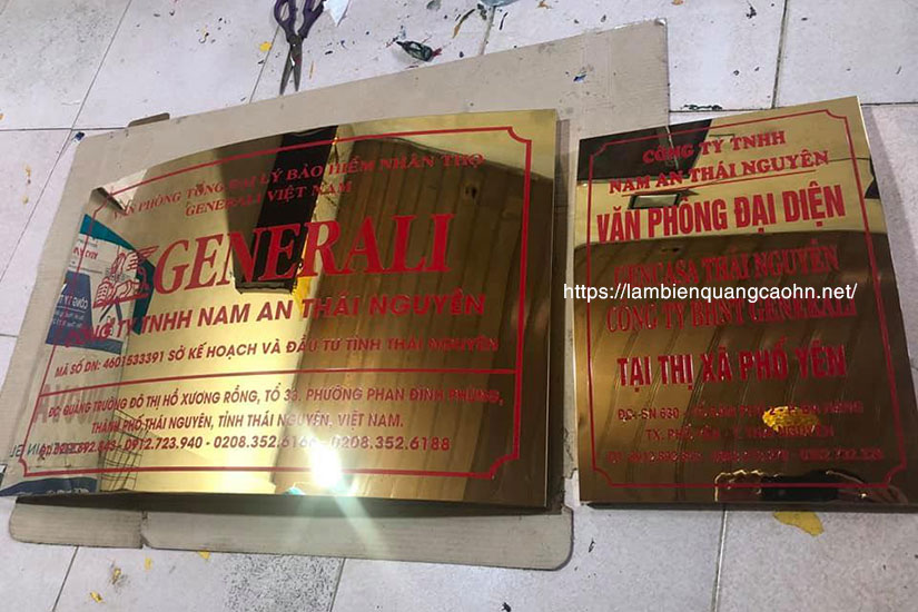 - Biển hiệu công ty bằng inox có độ sáng bóng đa dạng màu sắc vàng gương, vàng xước, bạc bóng, bạc xước...Có độ phản xạ ánh sáng tốt mang lại diện mạo sang trọng đảm bảo vẻ đẹp thẩm mỹ cuốn hút thể hiện sự chuyên nghiệp, đẳng cấp của công ty.