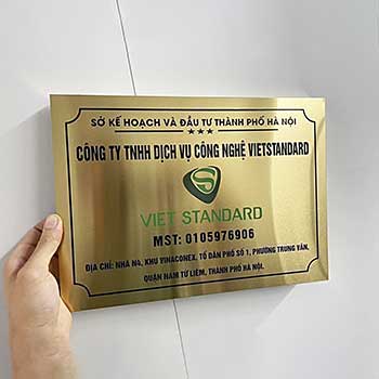 Về bản chất, đây là một khối rỗng vì nó được tạo ra bởi các mặt phẳng. Kích thước tiêu chuẩn của biển là 40x30x2cm. Biển sử dụng công nghệ ăn mòn vào inox hoặc in UV, có hai màu phổ thông là màu bạc và màu vàng, bề mặt có thể bóng hoặc xước, biển bắt buộc phải có nhân công đến tận nơi lắp đặt nên đơn giá là 1,650,000đ.