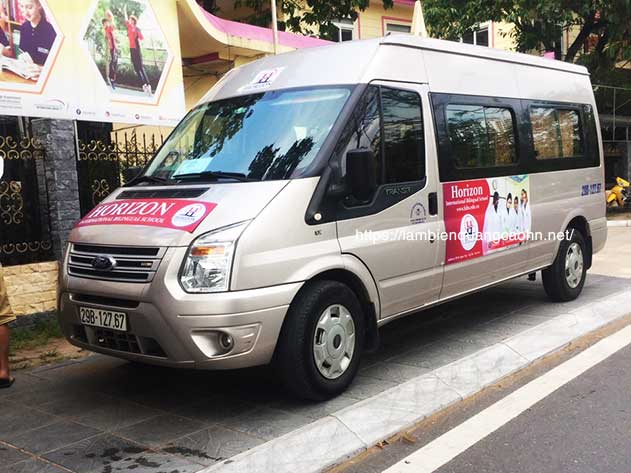 Tấm decal nam châm dẻo trên xe bus đưa đón học sinh của trường Horizon