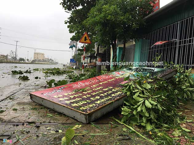 Các biển cửa hàng, biển công ty bị hỏng xô lệch, bị bong một phần mặt biển do gió bão. Thậm chí bị đổ, bị rơi