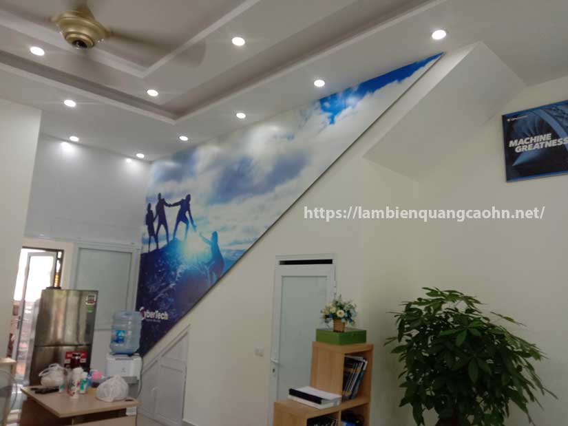 Dán decal lên tường: Dán hình ảnh tại vị trí góc tam giác của lối đi lên cầu thang, vừa tăng tính văn hóa của công ty vừa che được độ xấu, chất liệu decal ô tô cán mờ.