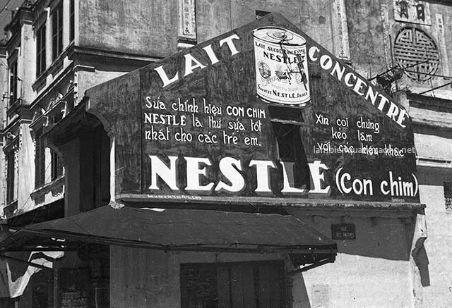 Đây là một bức ảnh của góc phố Hà Nội ngày xưa. Bức ảnh lấy từ một nhà sưu tầm người Pháp. Biển quảng cáo thời này chủ yếu là sơn vẽ lên tấm bảng gỗ hoặc sắt. Khá đơn giản.
