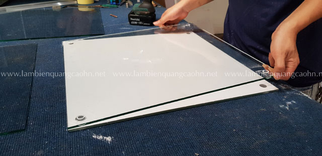 Kính hoặc mica cần phải được cắt chuẩn chỉ vào một kích thước tương đồng với sản phẩm in và vừa vặn với vị trí của biển quảng cáo mà khách hàng mong muốn, trong đó kích thước lỗ để bắt vít nở vào tường cũng cần phải tính toán cẩn thận để nó vừa đủ đẹp mà không bị ảnh hưởng tới hình ảnh!